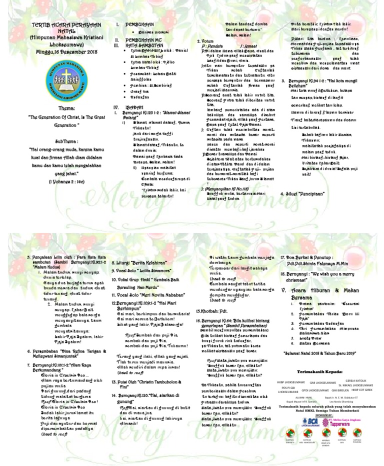 Dimulai dari awal persiapan hingga dimana hari h pernikahan tiba, tentunya semuanya itu dilakukan dengan secara matang dan penuh dengan perhitungan. Ajak dan libatkan seluruh guru sekolah minggu untuk. Kidung jemaat no.92 malam kudus. Susunan acara tersebut dibawakan oleh pembawa acara atau mc sebagai panduan untuk memimpin selama jalannya acara. Susunan acara perayaan natal ikatan keluarga toraja kabup kabupa aten barito barito utar utara a dan sekit sekitarn arny ya.